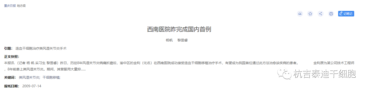 2009年,西南醫院完成了國內首例造血干細胞移植治療類風濕關節炎的臨床試驗。