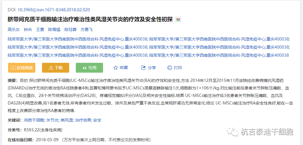 2018年,陸軍軍醫大學/第三軍醫大學西南醫院中西醫結合科進行了臍帶間充質干細胞輸注治療難治性類風濕關節炎的療效及安全性初探。