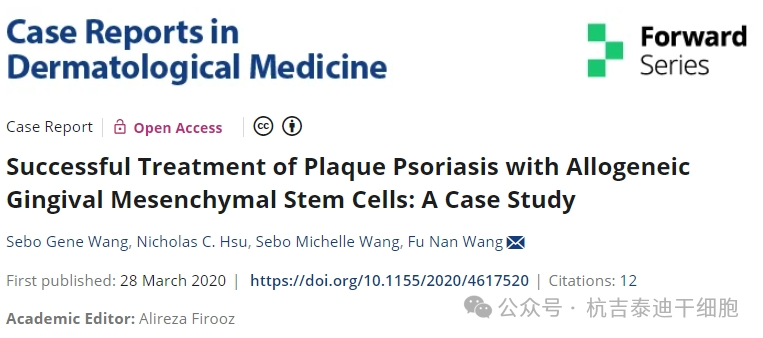 美國加州洛馬林達大學醫學院的團隊在行業期刊Case Rep Dermatol Med 上發表了題為Successful Treatment of Plaque Psoriasis with Allogeneic Gingival Mesenchymal Stem Cells: A Case Study(間充質干細胞成功治療斑塊性銀屑病:案例研究)(下圖)。