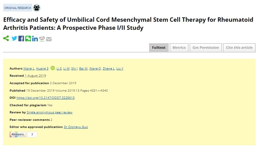 在最近的臨床試驗中,MSC治療RA患者已顯示出積極的結(jié)果。對64名確診為RA的患者注射UC-MSC(總劑量4×10^7個細(xì)胞)。