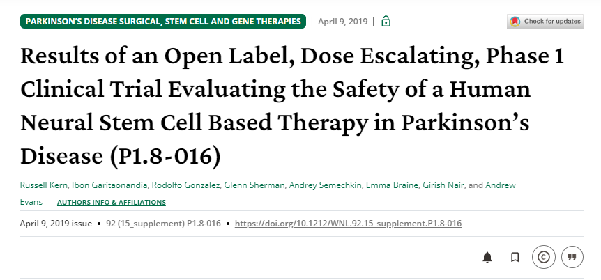 2019年4月9日,美國多家干細(xì)胞公司聯(lián)合在《Neurology》上發(fā)表了一篇名為《一項開放標(biāo)簽、劑量遞增的1期臨床試驗結(jié)果,該試驗評估了基于人類神經(jīng)干細(xì)胞的療法在帕金森病中的安全性 (P1.8-016)》的研究成果。[3]