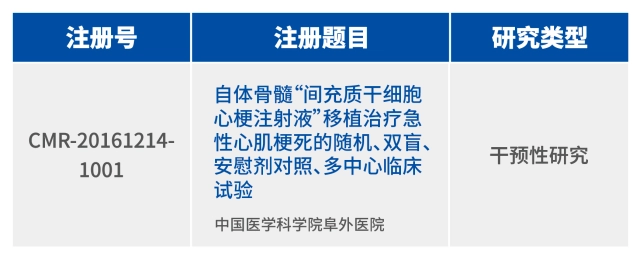 2016年年底,在我國(guó)醫(yī)學(xué)研究備案登記信息系統(tǒng)中,干細(xì)胞臨床研究項(xiàng)目《自體骨髓“間充質(zhì)干細(xì)胞心梗注射液”移植治療急性心肌梗死的隨機(jī)、雙盲、安慰劑對(duì)照、多中心臨床試驗(yàn)》獲得國(guó)家備案,得到了國(guó)家干細(xì)胞臨床研究專家委員會(huì)的集體認(rèn)可。