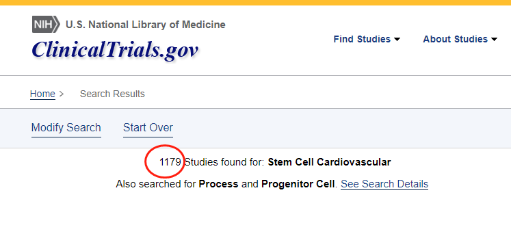 截止2022年12月,在美國(guó)國(guó)立衛(wèi)生研究院的最大臨床試驗(yàn)注冊(cè)庫(kù)clinicaltrials.gov網(wǎng)站上注冊(cè)的有關(guān)干細(xì)胞治療心血管疾病的臨床研究項(xiàng)目有1179項(xiàng)。