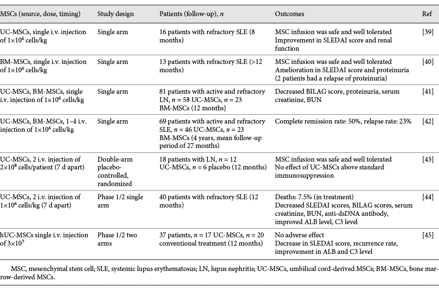 間充質干細胞治療的第一個I期試驗由Lazarus等人進行證明了在15名患者志愿者中進行離體培養(yǎng)擴增和靜脈輸注自體BM-MSC的安全性。從那時起,作為一種預防或治療造血干細胞移植后移植物抗宿主病的新工具,MSC 治療免疫疾病的報道不斷被報道。基于從MSCs治療狼瘡易發(fā)小鼠的那些臨床前研究中收集的令人鼓舞的數(shù)據(jù)結果,MSC群體已經(jīng)在LN患者的臨床試驗中進行了測試(表1)。