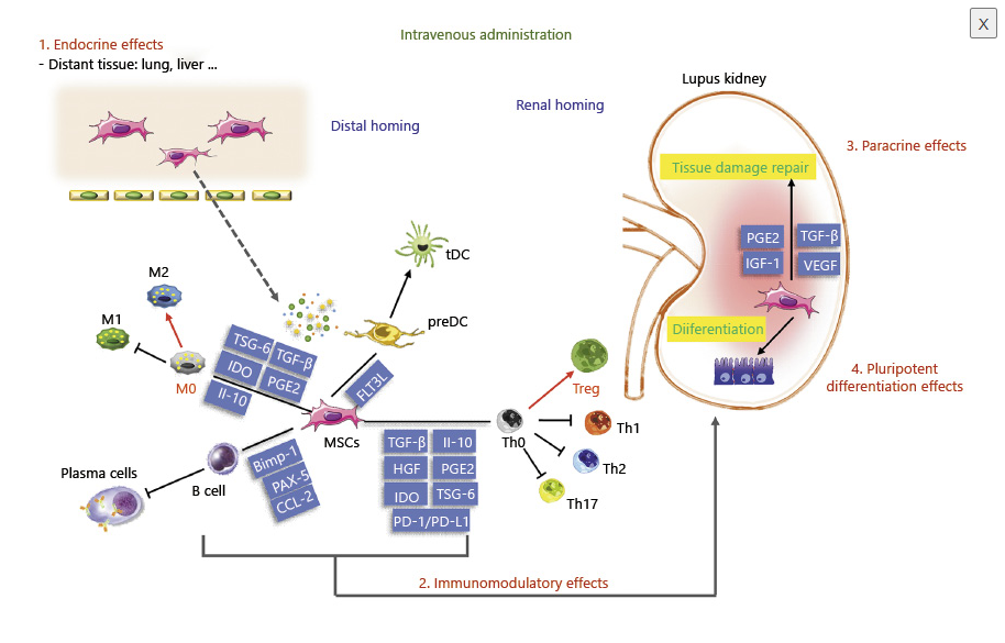 異基因間充質干細胞治療狼瘡腎炎的機制:通過分泌多種可溶性介質,與T細胞、B細胞、巨噬細胞、DC等多種免疫細胞相互作用發(fā)揮免疫調節(jié)作用;歸巢腎臟后促進修復和再生。