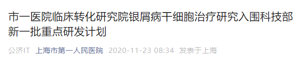 此外,2020年11月23號(hào),科技部公布了新一批重點(diǎn)研發(fā)計(jì)劃。其中,由上海市第一人民醫(yī)院臨床轉(zhuǎn)化研究院王宏林教授任首席科學(xué)家,中南大學(xué)湘雅醫(yī)院、廈門大學(xué)和湖南光琇高新生命科技有限公司共同參與的“間充質(zhì)干細(xì)胞治療銀屑病及銀屑病型關(guān)節(jié)炎的臨床研究”項(xiàng)目入圍“干細(xì)胞及轉(zhuǎn)化研究專項(xiàng)名單”,這也是上海市一醫(yī)院連續(xù)第二年獲得該重大專項(xiàng)。