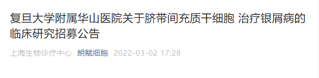 2022年3月,復(fù)旦大學(xué)附屬華山醫(yī)院關(guān)于臍帶間充質(zhì)干細(xì)胞 治療銀屑病的臨床研究招募公告。