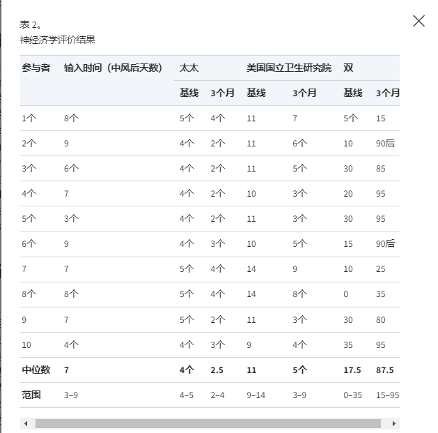 mRS是中風臨床試驗中使用最廣泛的臨床結果指標,用于衡量中風后個體日常活動的殘疾或依賴程度。我們使用 mRS 評分從基線(輸液)到輸液后3個月的平均變化作為研究的次要終點。研究參與者的中位mRS 在基線時為4.4±0.5(表2)。