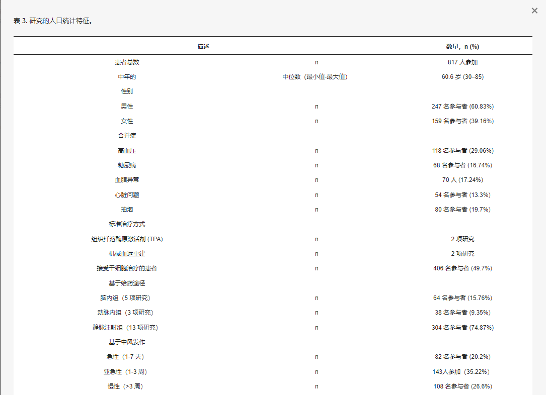 在21項研究中,共納入836名患者,中位年齡為60.6歲(范圍30-85 歲)。干細胞治療組由406名患者組成;247名 (60.83%) 參與者為男性,159名 (39.16%) 參與者為女性