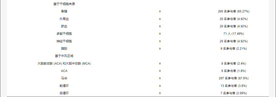 施用了六種不同的干細胞類型和來源,即骨髓、外周血、臍帶血、成體祖細胞和人類神經干細胞。大多數參與者接受了骨髓來源的干細胞治療(265名參與者,65.27%),其次是多能干細胞(71名,17.49%),神經來源的外周血和臍血來源的干細胞分別給予20( 4.92%) 參與者。在最近的研究中,九名 (2.21%) 參與者使用了脂肪來源的干細胞(表3)。