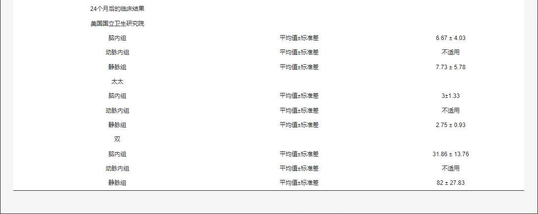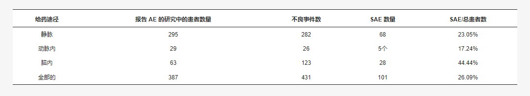 在動脈內組中,26例 (6.03%) 患者發生了AE,其中5例 (19.23%) 被歸類為嚴重,占報告的動脈內組AE患者的17.24%。表5提供干細胞給藥途徑的不良事件的總結。