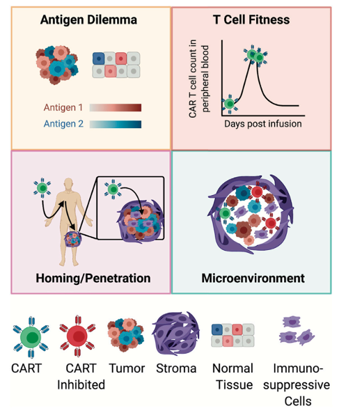 目前 CAR-T 治療實(shí)體瘤,應(yīng)答率和有效率都極低,相關(guān)機(jī)制討論中,涉及缺乏特異性腫瘤相關(guān)抗原,物理屏障阻隔 CAR-T 穿透入實(shí)體瘤內(nèi)部,惡劣的腫瘤微環(huán)境誘導(dǎo) CAR-T 功能耗竭等。