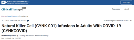 美國生物技術Celularity公司的NK細胞療法CYNK-001獲得FDA批準在COVID-19成年患者開展臨床試驗的細胞免疫療法。該公司開展了I/II期臨床研究,研究入組86名COVID-19患者。