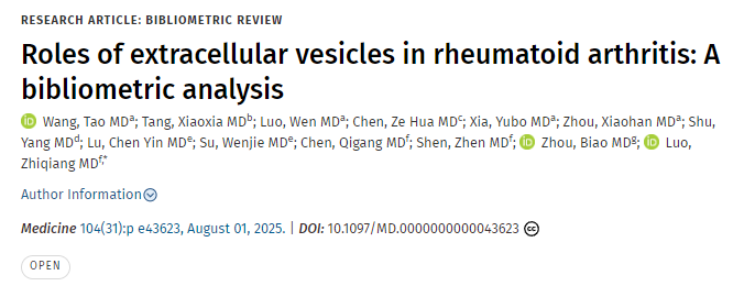 [9]Wang, Tao MDa; Tang, Xiaoxia MDb; Luo, Wen MDa; Chen, Ze Hua MDc; Xia, Yubo MDa; Zhou, Xiaohan MDa; Shu, Yang MDd; Lu, Chen Yin MDe; Su, Wenjie MDe; Chen, Qigang MDf; Shen, Zhen MDf; Zhou, Biao MDg; Luo, Zhiqiang MDf,*. Roles of extracellular vesicles in rheumatoid arthritis: A bibliometric analysis. Medicine 104(31):p e43623, August 01, 2025. | DOI: 10.1097/MD.0000000000043623