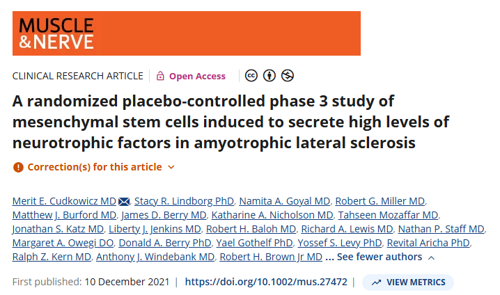 2021年,《肌肉與神經(jīng)主頁》發(fā)表了一項“隨機(jī)、安慰劑對照的3期臨床研究,旨在評估間充質(zhì)干細(xì)胞誘導(dǎo)分泌高水平神經(jīng)營養(yǎng)因子治療肌萎縮側(cè)索硬化癥的效果[2]。