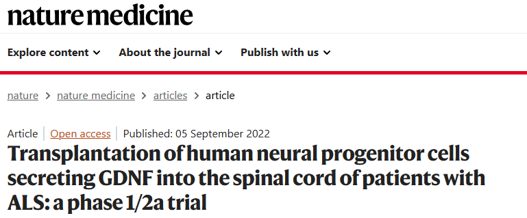 2022年,一項將分泌GDNF的人類神經(jīng)祖細(xì)胞移植到ALS患者脊髓中:一項1/2a期試驗表明,將分泌GDNF的人類神經(jīng)祖細(xì)胞(CNS10-NPC-GDNF)移植到脊髓中,在42個月內(nèi)是可行且安全的,并且未對運(yùn)動功能產(chǎn)生負(fù)面影響[3]。