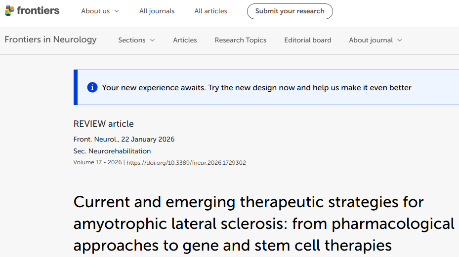 [1]:Wang Z, Huang J and Yun D (2026) Current and emerging therapeutic strategies for amyotrophic lateral sclerosis: from pharmacological approaches to gene and stem cell therapies. Front. Neurol. 17:1729302. doi: 10.3389/fneur.2026.1729302