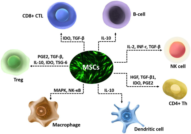 MSC通過破壞免疫細胞的激活、增殖、成熟、細胞溶解活性、細胞因子產生或抗體產生來調節免疫細胞。中樞神經系統及其屏障充滿了先天性和適應性免疫細胞,它們在疾病中與神經膠質細胞相互作用。免疫細胞和神經膠質細胞之間的相互作用已被證明在中樞神經系統的再生能力中發揮著關鍵作用。間充質干細胞對免疫細胞的作用可能參與免疫細胞與神經膠質細胞的相互作用,進而影響中樞神經系統的再生。