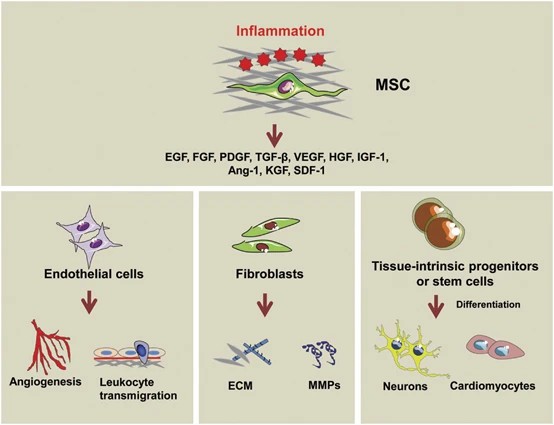因此,這些炎癥分子和免疫細胞與內皮細胞和成纖維細胞一起,協調微環境的變化,導致間充質干細胞動員和分化為基質和/或替代受損組織細胞。