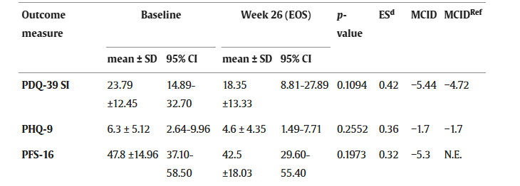PHQ-9 評(píng)分明顯改善,平均值 (SD) 從基線時(shí)的 6.3 (5.12) 下降到 EOS(第 26 周)時(shí)的 4.6。觀察到的 MCID 為 -1.7 分(表 2 ),與參考的 MCID相當(dāng),表示與基線相比,癥狀嚴(yán)重程度降低了約 27%,40% 的受試者獲得改善。