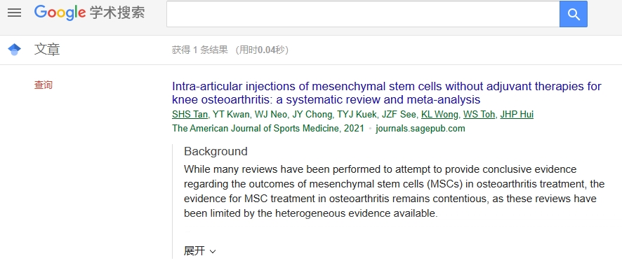 2021年,美國運動雜志醫學雜志發表了一篇《關節內注射間充質干細胞治療膝關節骨關節炎而不進行輔助治療:系統評價與薈萃分析》的文獻綜述。