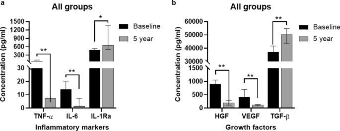 圖2:所有組 (n=11) 的炎癥標志物 (a) 和生長因子 (b)水平在基線和5年隨訪期間的比較。