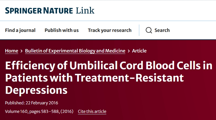 2016年,“實驗生物學和醫(yī)學公報”報道了一項“臍帶血細胞對難治性抑郁癥患者的療效”的臨床研究結果。