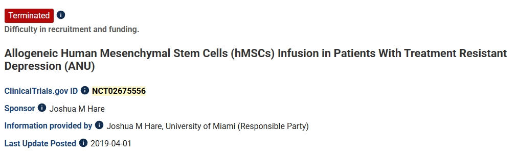 第一項:2019年,澳大利亞國立大學進行了一項異基因人類間充質(zhì)干細胞(hMSCs)輸注治療難治性抑郁癥患者的臨床試驗。