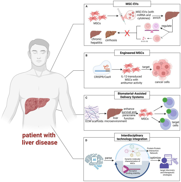 第二,結(jié)合基因編輯與生物材料工程的細(xì)胞功能強(qiáng)化與遞送系統(tǒng)優(yōu)化策略:利用CRISPR/Cas9等工具對MSCs進(jìn)行預(yù)編輯(如敲除Smad7或?qū)隝L-12),可從源頭增強(qiáng)其免疫調(diào)節(jié)或抗腫瘤功能;誘導(dǎo)多能干細(xì)胞來源的MSCs則為標(biāo)準(zhǔn)化、規(guī)模化生產(chǎn)提供了可復(fù)制的細(xì)胞平臺。與此同時(shí),生物材料工程(如脫細(xì)胞ECM水凝膠、MSCs球體培養(yǎng))通過模擬肝臟微環(huán)境,顯著提升工程化MSCs及其分泌的SpEVs在體內(nèi)的存活率、滯留時(shí)間與生物學(xué)功能。