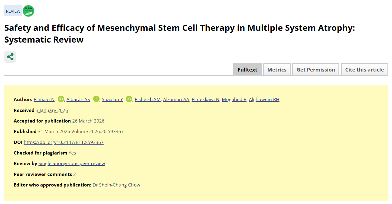 [1]:Elimam N, Albarari SS, Shaalan Y, Elsheikh SM, Alzamari AA, Elmekkawi N, Mogahed R, Alghuweiri RH. Safety and Efficacy of Mesenchymal Stem Cell Therapy in Multiple System Atrophy: Systematic Review. Biologics. 2026 Mar 31;20:593367. doi: 10.2147/BTT.S593367. PMID: 41938822; PMCID: PMC13050157.
