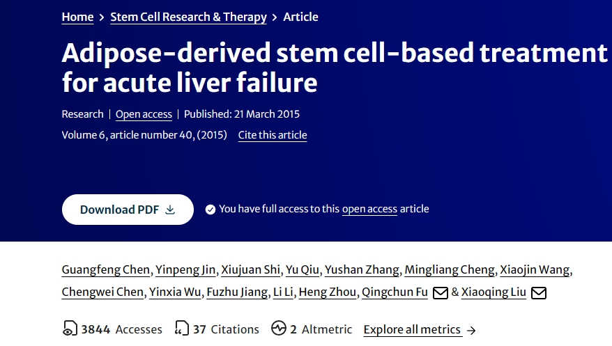 2015年3月21日,同濟大學醫學院第十人民醫院聯合南京軍區上海肝病研究中心在國際期刊《Stem Cell Research & Therapy》上發表了一篇關于Adipose-derived stem cell-based treatment for acute liver failure(基于脂肪干細胞的急性肝衰竭治療)的文章。