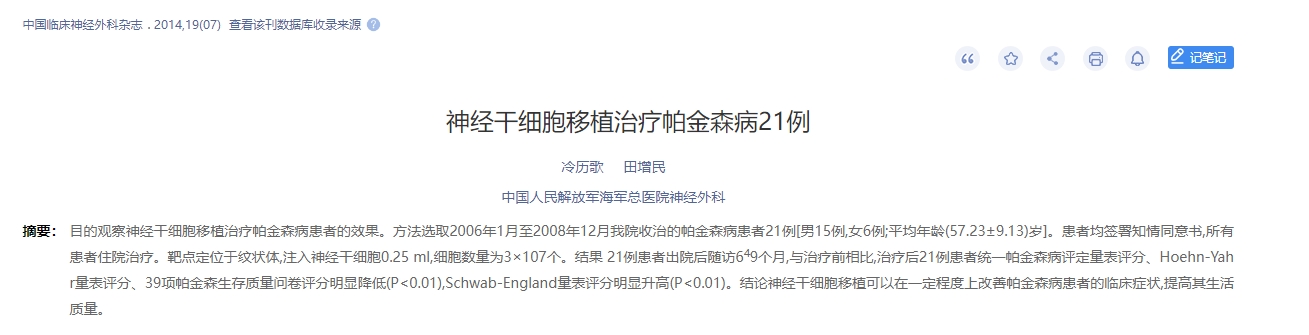 2014年,中國人民解放軍海軍總醫院神經外科進行了一項神經干細胞移植治療21帕金森病的臨床案例。