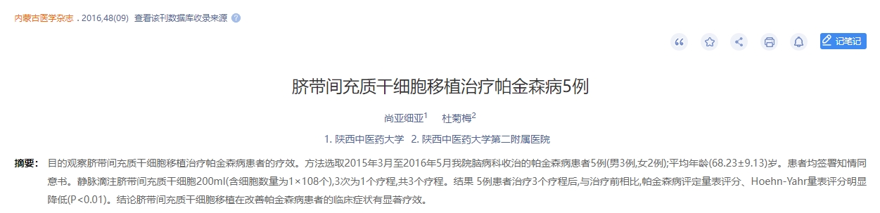 2016年,陜西中醫藥大學發表一篇臍帶間充質干細胞移植治療帕金森病5例的文章。