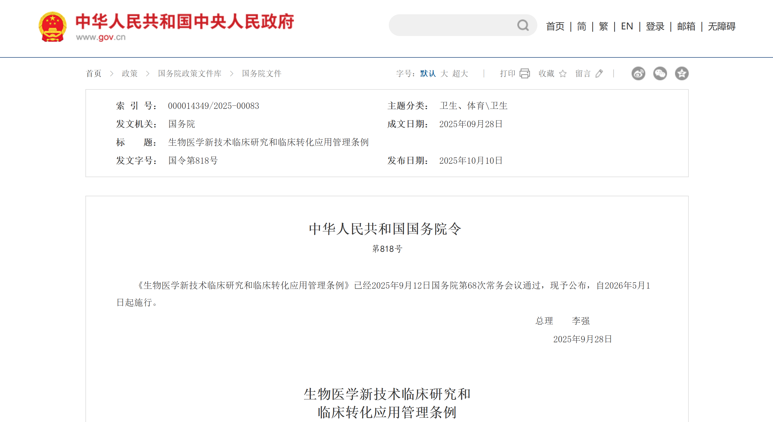 2025年9月28日,國務(wù)院總理李強(qiáng)簽署第818號令,正式公布《生物醫(yī)學(xué)新技術(shù)臨床研究和臨床轉(zhuǎn)化應(yīng)用管理條例》。這部將于2026年5月1日施行的法規(guī),被業(yè)界視為中國生物醫(yī)學(xué)領(lǐng)域的“基本法”,標(biāo)志著細(xì)胞與基因治療等前沿技術(shù)正式邁入“有法可依、有序創(chuàng)新”的全新發(fā)展階段。