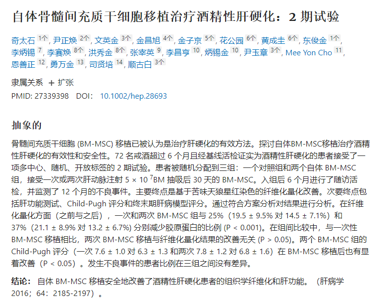 在一項(xiàng)多中心、隨機(jī)、開放標(biāo)簽的2期試驗(yàn)中,自體骨髓間充質(zhì)干細(xì)胞移植安全地改善了肝功能,并促進(jìn)了酒精性肝硬化患者肝活檢后纖維化的量化。