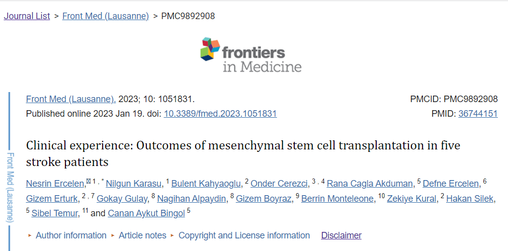 主要參考文獻:Ercelen N, Karasu N, Kahyaoglu B, Cerezci O, Akduman RC, Ercelen D, Erturk G, Gulay G, Alpaydin N, Boyraz G, Monteleone B, Kural Z, Silek H, Temur S, Bingol CA. Clinical experience: Outcomes of mesenchymal stem cell transplantation in five stroke patients. Front Med (Lausanne). 2023 Jan 19;10:1051831. doi: 10.3389/fmed.2023.1051831. PMID: 36744151; PMCID: PMC9892908.
