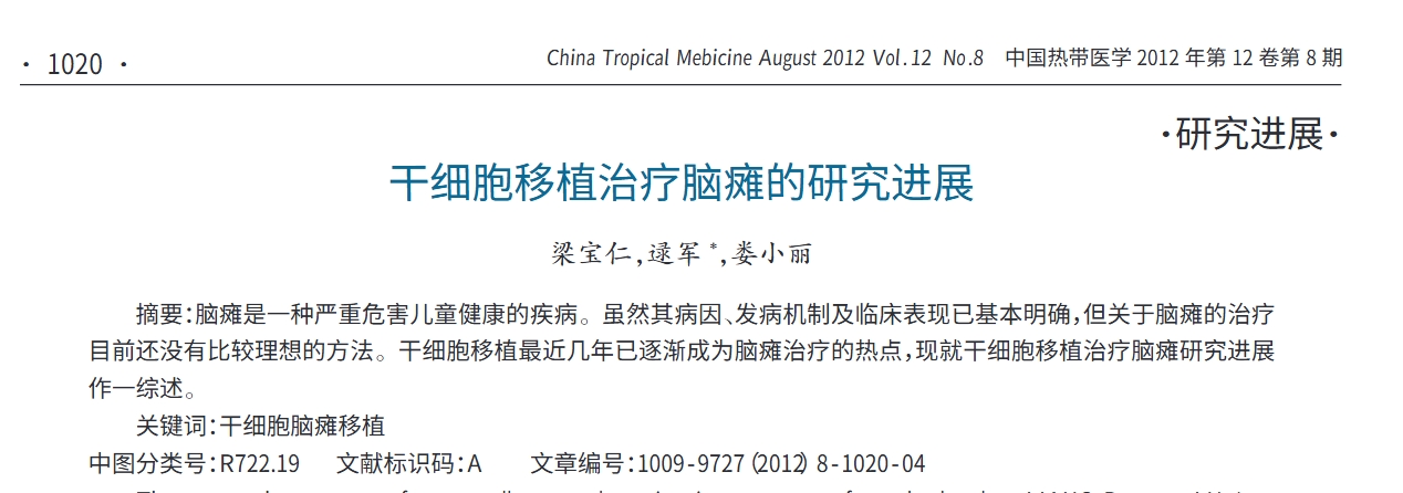 梁寶仁, 逯軍, & 婁小麗.?(2012).?干細(xì)胞移植治療腦癱的研究進(jìn)展.?中國熱帶醫(yī)學(xué),?12(08),?1020-1022+1032.