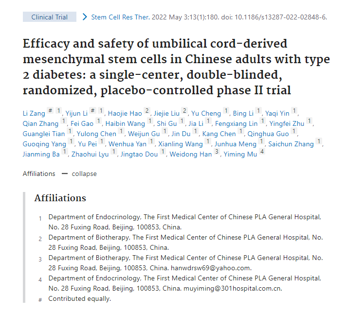 2022年5月,《Stem Cells Research & Therapy》期刊上公布了一項單中心、隨機、雙盲對照間充質干細胞治療2型糖尿病二期臨床研究結果。該項研究由解放軍總醫院內分泌科母義明教授、生物治療中心韓衛東教授領銜。試驗結果表明,通過靜脈輸注給予UC-MSCs(臍帶間充質干細胞)是一種安全有效的方法,可以減少外源性胰島素需求,緩解2型糖尿病患者的胰島素抵抗。臍帶間充質干細胞移植是2型糖尿病的潛在治療選擇。