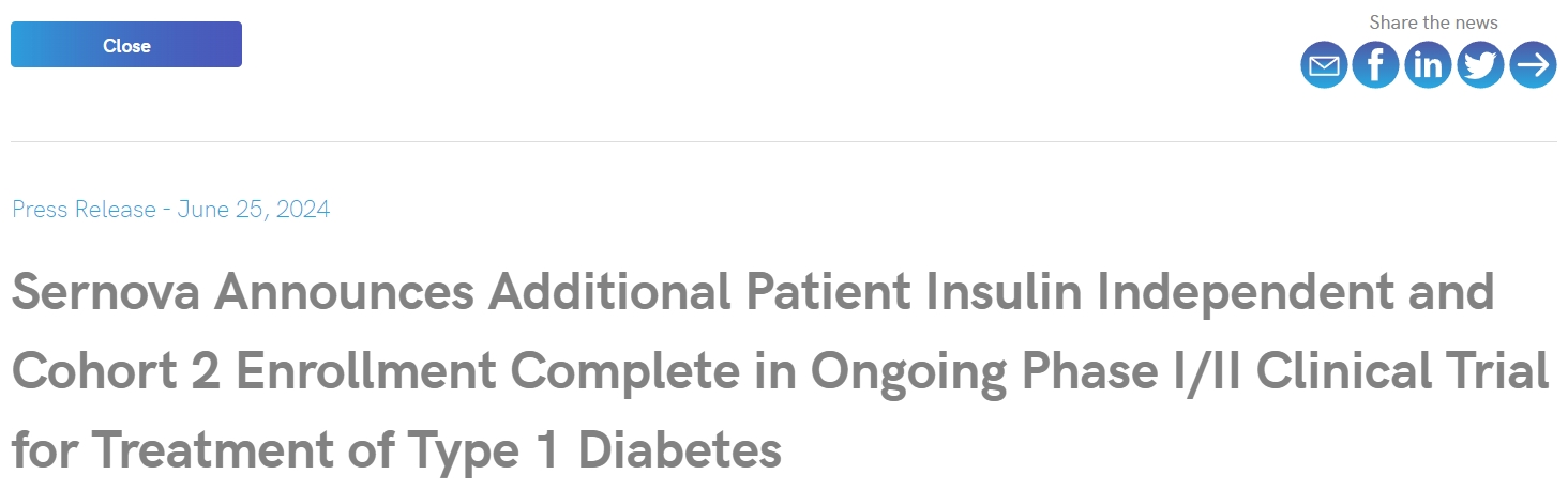 Sernova現(xiàn)臨床研究進展:2024年6月25日,據(jù)Sernova官網(wǎng)報道Sernova宣布正在進行的1型糖尿病治療I/II期臨床試驗中,額外胰島素獨立患者和第2組患者入組已完成。