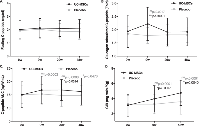 - UC-MSCs組中胰高血糖素刺激的C肽水平倍數變化在9周時增加,并在20和48周時逐漸降低。而安慰劑組C肽水平變化倍數逐漸下降。(圖5B)
