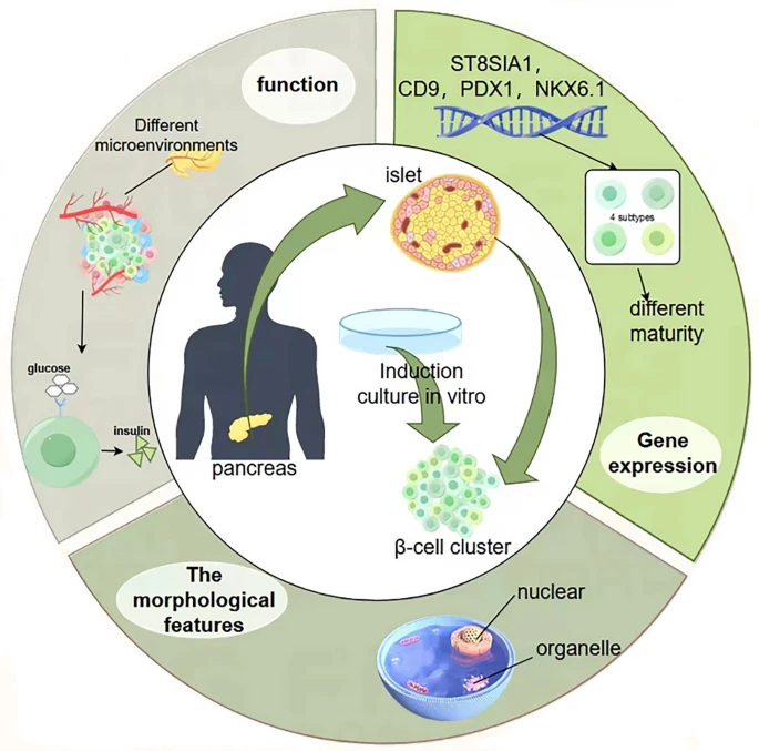胰腺β細胞的形態、功能和基因表達并不一致。就形態異質性而言,不同β細胞的細胞核和其他細胞器的大小不同。就基因表達而言,不同成熟階段的β細胞表現出不同的表面標志物表達,例如ST8SIA1和CD9,以及β細胞標志物表達,例如PDX1和NKX6.1。就功能而言,不同β細胞群體的應激反應和胰島素分泌并不相同