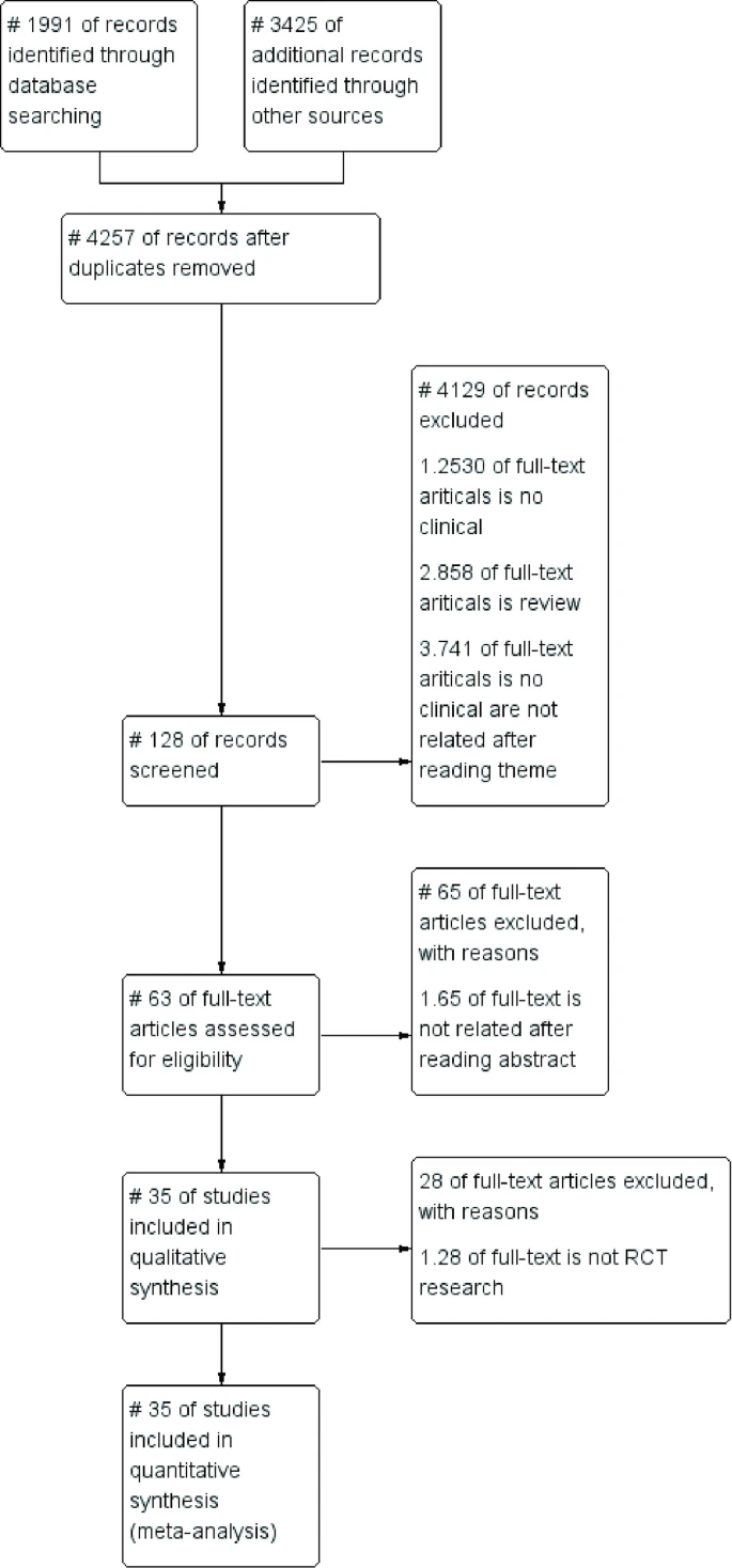 流程圖概述:通過(guò)系統(tǒng)檢索PubMed(1991篇)、Embase及Cochrane數(shù)據(jù)庫(kù)(共3425篇),初步納入5416篇文獻(xiàn),經(jīng)去重后剩余4257篇。按排除標(biāo)準(zhǔn)分步篩選:排除2530篇非臨床研究(如基礎(chǔ)實(shí)驗(yàn)、動(dòng)物研究)、858篇綜述、741篇摘要不相關(guān)文獻(xiàn)、65篇全文不相關(guān)文獻(xiàn)及28篇不符合RCT設(shè)計(jì)的文獻(xiàn),最終納入35項(xiàng)研究進(jìn)行薈萃分析(圖1)。