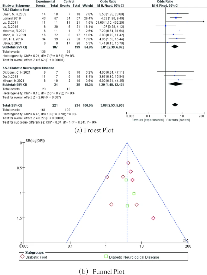 基于11項(xiàng)研究(8項(xiàng)足潰瘍、3項(xiàng)神經(jīng)病變)的數(shù)據(jù)顯示,兩組療效高度一致,且組間無(wú)顯著差異(P=0.84)。異質(zhì)性檢驗(yàn)(I2=0)及森林圖分布(圖10b)證實(shí)結(jié)果高度可靠,提示MSCs對(duì)不同糖尿病并發(fā)癥的療效具有普適性,為臨床擴(kuò)展應(yīng)用提供了證據(jù)支持。