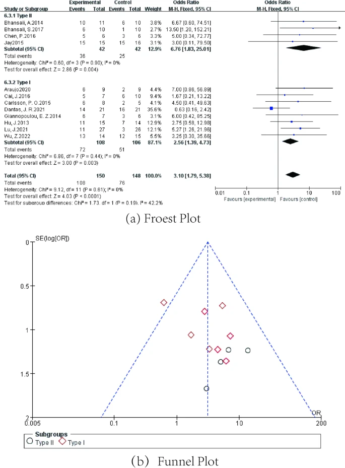 本研究通過(guò)薈萃分析評(píng)估間充質(zhì)干細(xì)胞治療1型糖尿病與2型糖尿病的療效差異。基于12項(xiàng)研究(8項(xiàng)I型、4項(xiàng)II型)的二分類(lèi)數(shù)據(jù),固定效應(yīng)模型顯示MSCs對(duì)兩類(lèi)糖尿病均具有顯著療效,且置信區(qū)間未跨越無(wú)效值。分層分析表明,II型糖尿病的效應(yīng)值(6.76)顯著高于I型(2.56),表明MSCs在治療II型糖尿病方面更有效。這些數(shù)據(jù)為糖尿病提供了新的見(jiàn)解,其中MSCs是治療II型糖尿病最有效的方法。