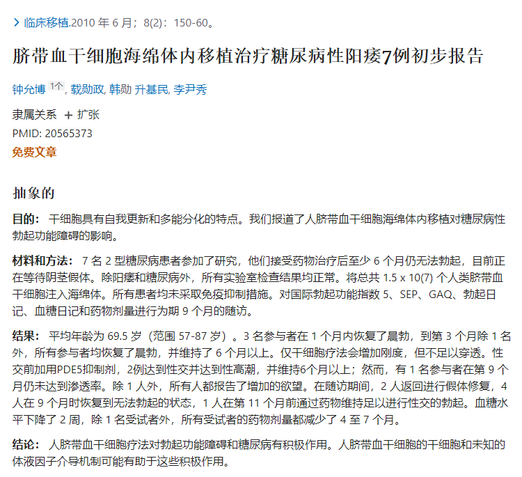 多項(xiàng)臨床證明!干細(xì)胞治療可改善糖尿病患者勃起功能障礙功能