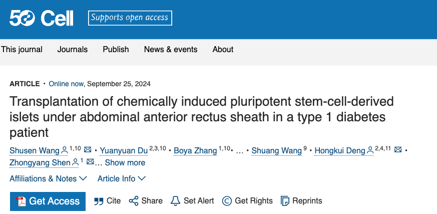 [6]Shusen Wang et al., (2024) Transplantation of chemically induced pluripotent stem-cell-derived islet under the abdominal anterior rectus sheath in a type 1 diabetes patient, Cell Doi: https://doi.org/10.1016/j.cell.2024.09.004