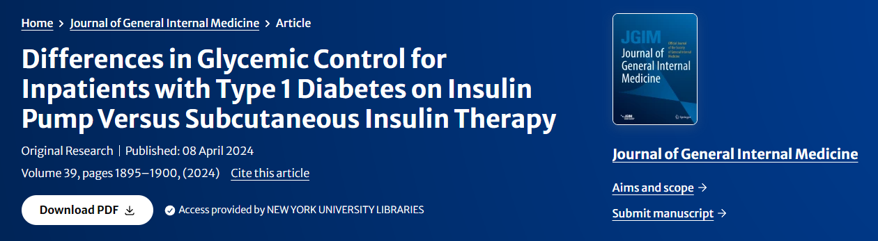 [1]Ye, Y., Acevedo-Mendez, B.A., Izard, S.?et al.?Differences in Glycemic Control for Inpatients with Type 1 Diabetes on Insulin Pump Versus Subcutaneous Insulin Therapy.?J GEN INTERN MED?39, 1895–1900 (2024). https://doi.org/10.1007/s11606-024-08736-4