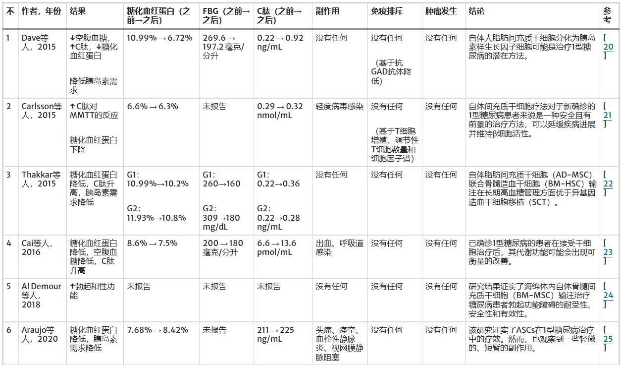 有效性證據(jù):所有被綜述的研究均顯示出積極的臨床改善信號(hào)。具體體現(xiàn)在:降低空腹血糖(FBG) 和降低糖化血紅蛋白(HbA1c) 水平,表明長(zhǎng)期血糖控制得到改善;減少外源性胰島素的注射需求,這是患者最直接的獲益;以及提高或維持C肽水平,C肽是反映胰島β細(xì)胞功能的金標(biāo)準(zhǔn),其水平升高或穩(wěn)定表明MSCs治療有助于改善或保護(hù)了殘存的β細(xì)胞功能。