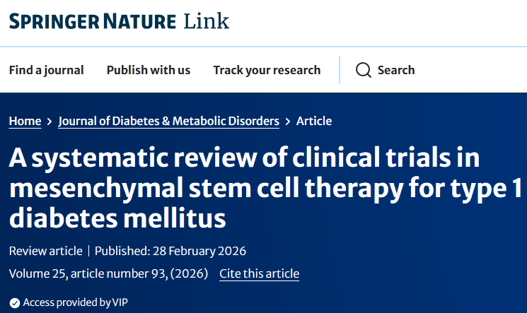 [1]:Dayer, D., Ahadi, S. & Khaksar, M.A. A systematic review of clinical trials in mesenchymal stem cell therapy for type 1 diabetes mellitus. J Diabetes Metab Disord 25, 93 (2026). https://doi.org/10.1007/s40200-026-01920-9