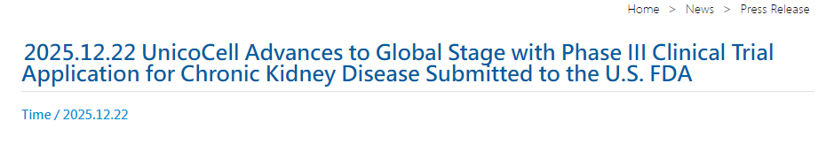 12月22日,UnicoCell Biomed Co., Ltd.宣布,已向美國食品藥品監(jiān)督管理局(FDA)提交其同種異體脂肪來源間充質干細胞新藥ELIXCYTE?用于治療慢性腎臟?。–KD)的Ⅲ期臨床試驗IND申請,標志著該項目正式邁入全球關鍵臨床階段。[11]